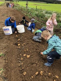 Auf dem Acker sammelte eine Gruppe zunächst Kartoffeln, die zweite Gruppe bekam anhand von kindgerechten Schaubildern interessante Einblicke in die Kartoffelernte mit Hilfe diverser Maschinen. Deren Funktion konnten die Kinder sehr schön auf den Bildern nachvollziehen.