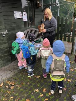 Wir haben Geschichten gelesen und mit den Kindern besprochen, was Eichhörnchen fressen und wo sie wohnen. Denn Eichhörnchen wohnen nicht in einem üblichen Nest, sondern in einem Kobel. Die Kinder haben sich alles gut gemerkt!
