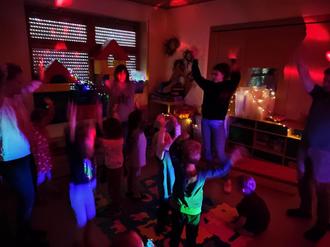 Am Tag der Disco schmückten die 4 Kinder den Raum, errichteten eine Tanzfläche, hängten die bunten Lichter auf und bereiteten das Popcorn zu. Jeder war sehr aufgeregt. Zur Disco kamen dann alle Kinder von klein bis groß und tanzten zur Musik, aßen Popcorn und hatten viel Spaß. Das war ein toller Vormittag.