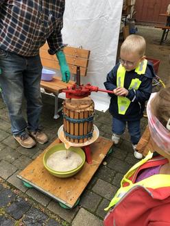 Anschließend durften die Kinder beim Keltern selbst mit anpacken. Sie lernten, wie früher mit einer alten mechanischen Presse gearbeitet wurde, und staunten, wie heute moderne elektrische Geräte die Arbeit erleichtern.