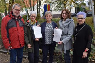 V.l.: Robert Krebs (Erster Beigeordneter Gemeinde), Birgit Sucke, Silvia Scheu-Menzer (Bürgermeisterin), Anett-Christin Hochheim und Regina Hagelstein (Sprecherin der Steuerungsgruppe Hünfelden) bei der Bescheidübergabe