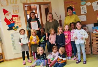 Die Kinder zeigen stolz ihr Prädikat. Hintere Reihe: Janine Becker (Arbeitskreis Jugendzahnpflege Limburg-Weilburg), Katrin Hartmann (Leitung Kita Mensfelden) und Larisa Rudi (Erzieherin)