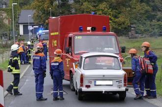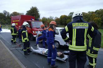 Als die Einsatzkräfte alarmiert wurden, konnte sich keiner der Jugendlichen und auch Feuerwehrleuten vorstellen, welches Ausmaß dieser angenommene Schadensfall hatte. Die ausrückenden Kräfte erhielten über Funk die Meldung, dass es sich um auslaufende chemische Stoffe auf einem Klein-LKW handelte. Dieses Gefahrgut ist aufgrund des Aufpralls von der Ladefläche gerutscht und begann zu brennen. Umso sensibler mussten die Verantwortlichen die Trupps einsetzen, um drei verletzte Personen zu retten. Bei dieser Übung kam es in erster Linie darauf an, bei der Personenrettung auch die eigenen Kameraden gefahrlos und trotzdem schnell und gezielt einzusetzen.