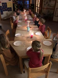 Um 17 Uhr trafen sich die „Großen“ Kita-Kinder gemeinsam in gemütlicher Runde bei Kerzenschein und Kuchen. Zur Einstimmung auf das Fest hörten wir noch einmal die Geschichte von Sankt Martin und sangen Martinslieder.