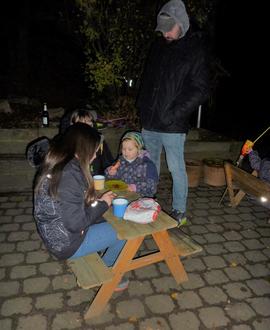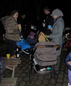 Dann ging es im Laternenzug, mit Haltestationen zum gemeinsamen Singen, auf den Weg am dunklen Waldrand entlang.