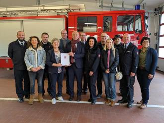 Bürgermeisterin Silvia Scheu Menzer (vierte v.l.) mit dem Landtagsabgeordneten Christian Wendel (fünfter v.l.), Innenminister Roman Poseck (sechster v.l.) bei der Förderbescheidübergabe mit Vertreterinnen und Vertretern aus Politik, Feuerwehr und Verwaltung