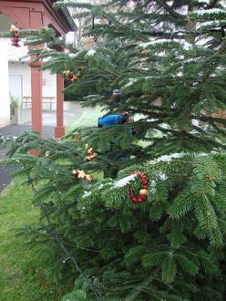 In diesem Jahr wurde ein „essbarer“ Baumschmuck, gemeinsam mit den Kindern, als gruppenübergreifendes Angebot hergestellt. Baumschmuck als Futterstation, mit aufgefädelten Nuss-Ketten, Hagebutten-Ketten, Vogelfutteranhängern aus Körnern und Fett, die mit Förmchen ausgestochen wurden.