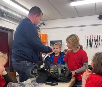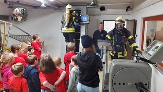 In Limburg angekommen, wurden 17 neugierige Kids von Holger Reichert, hauptamtlicher Gerätewart, herzlich begrüßt. Gemeinsam ging es in den Schulungsraum, wo die Löschzwerge erstmal die Ohren spitzten. Hier erklärte Holger alles Wichtige rund um das Thema Atemschutz und jedes Kind konnte mal die Luft aus der Flasche schnuppern. Vor den Augen der Kinder rüsteten sich zwei Feuerwehrmänner unter Atemschutz aus und Alle waren überrascht, dass Kleidung und sämtliche Ausrüstungsgegenstände zusammen ungefähr so schwer wie ein Löschzwerg (ca. 25kg) ist.