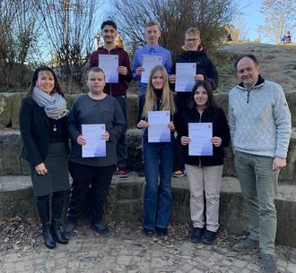 Stolz zeigen die ausgezeichneten Schüler und Schülerinnen ihre Urkunden Von links: Schulleiterin Judith Lehnert, Fin Klaus, Youssef Horo, Yanick Satony, Nelli Maschmeyer, Kevin Stein, Laura Cambria-Zurro und Realschul- und Gymnasialzweigleiter Jürgen Kneipper