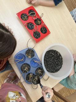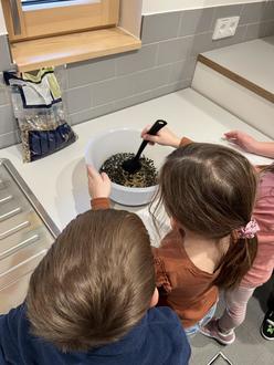 Im Schlaufuchstreffs stellten unsere Vorschulkinder mit viel Begeisterung ihr eigenes Vogelfutter her. Mit großer Neugier und Vorsicht durften die Kinder das geschmolzene Kokosöl mit verschiedenen Vogelkörnern vermischen. Anschließend wurde die Masse sorgfältig in kleine Förmchen gegossen. Für die Kinder war es spannend zu beobachten, wie aus den einzelnen Zutaten nach und nach kleine Futterkuchen entstanden.