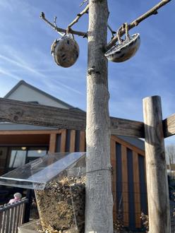 Geduld war dann ebenfalls gefragt. Über Nacht mussten die Förmchen ruhen, damit das Vogelfutter richtig fest werden konnte. Am nächsten Vormittag war es endlich so weit. Gemeinsam mit allen Kindern der Kita wurden die fertigen Futterbällchen in den Bäumen auf dem Außengelände verteilt. Nun schauen die Kinder täglich nach, wie die Vögel sich das Futter aus den Bäumen holen.