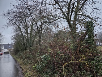 Entlang des Fußweges westlich des neuen Baugebietes bleiben die Gehölze zunächst temporär als breiter Heckenstreifen erhalten, da hier aktuell noch keine Baulandfreilegung erfolgen muss.