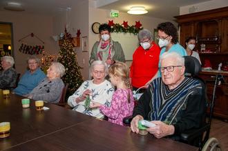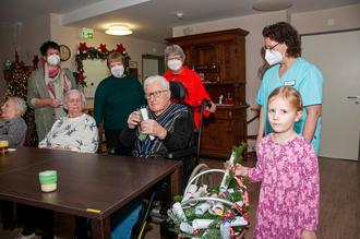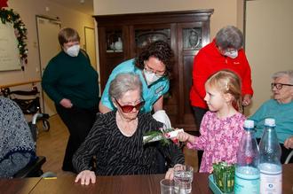 Corona-bedingt überreichte die 5jährige Samira Feller im Namen der Kinder die bunten Malereien und verschenkte damit viel Freude an die glücklichen Empfänger. Sie hatte selbst drei Bilder gemalt und sich vor dem Weihnachtsbesuch tapfer einem PCR-Coronatest unterzogen. Unterstützt wurde sie dabei durch die VdK-Ortsverbandsvorsitzende Astrid Stähler-Becker und deren Stellvertreterin Monika Feller, Samiras stolze Oma.