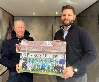 Der Geschäftsführer der Fa. Gehrke, Nils Gehrke (rechts) empfing nun den Trainer der JSG Hünfelden im neuen Firmensitz. Hier erhielt er aus den Händen von Gerold Jäger (links) ein Mannschaftsfoto auf Leinwand, welches nun in den neuen Räumlichkeiten einen Ehrenplatz findet.