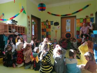 Mit einem gemeinsamen Singkreis von allen bekannten Faschings- und Bewegungsliedern klang die Partystimmung langsam aus und endete nach einem kleinen Bonbonregen mit einem dreifach donnernden Kita Pusteblume, HELAU, Neesbach, HELAU, Fasching, HELAU.