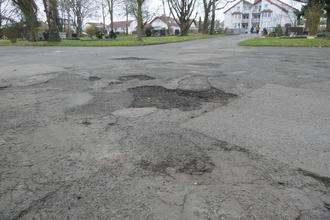 Auf allen Friedhöfen, das Bild zeigt den Platz vor der Friedhofshalle in Offheim, weisen die Aspaltdecken der Wege deutliche Schäden auf.
