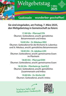 | 18.00 | St. Jakobus LHH Weltgebetstag der Frauen von den Cook-Inseln, Thema "Wunderbar geschaffen", anschl. Imbiss im Pfarrheim |