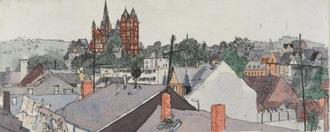 Eine Radierung „Blick über die Dächer von Limburg“, aquarelliert auf Maschinenbütten von Klaus Panzner.