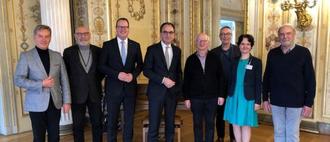 Finanzminister Michael Boddenberg (Mitte), Landtagsabgeordneter Christian Wendel (dritter von links), die Vertreter des Leitungsteams, Thomas Hecker, Dr. Eberhard Dielmann, Frank Sittel, Stefan Bohlmann, Christine Freifrau von Münster und Alfred Runkler (v.l.n.r.), im großen Konzertsaal des ehemaligen Wiesbadener Stadtschlosses