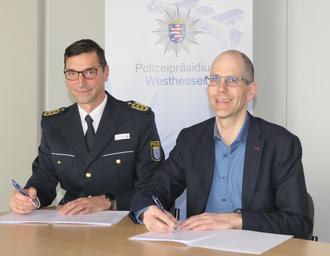Polizeipräsident Felix Paschek (links) und Limburgs 1. Stadtrat Michael Stanke unterzeichnen den Zehn-Punkte-Plan.