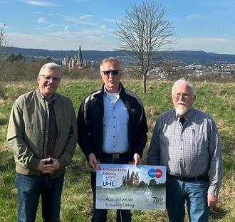 Eine Spende für einen Turm auf dem Greifenberg übergab Wolfram Uhe (Bildmitte) an Bürgermeister Dr. Marius Hahn (links) und den Vorsitzenden des Verkehrs- und Verschönerungsvereins, Paul-Josef Hagen.