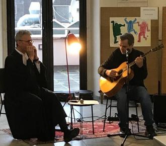 Einen ganz besonderen Gottesdienst erlebten die Besucher am Sonntagabend in der Kirche am Bahnhof: Der Bluesmusiker Biber Hermann war zu Gast und musizierte gemeinsam mit Pfarrer Markus Stambke Songs von Bob Dylan. Beide hielten eine ungewöhnliche Predigt - mit Gitarre, Mundharmonika und einem Dialog über den Dylan-Song „I shall be released“. Eine Mut machende Predigt immer „an das Licht zu glauben, an mein Licht zu glauben, das auf mich zukommt, auch wenn die Zeiten dunkel sein mögen“.