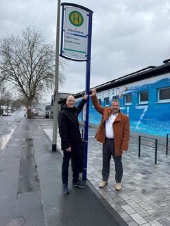 Limburgs 1. Stadtrat und Betriebsleiter der Stadtlinie, Michael Stanke, und Bürgermeister der Gemeinde Elz, Matthias Schmidt, vor der Haltestelle am Elzer Freibad. Zur Freibadsaison kann auch der LahnStar zur sicheren und bequemen Hin- und Rückfahrt gebucht werden.