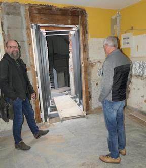 Vom Saalbau aus nehmen Architekt Axel Schmidt (links) und Markus Saal vom Hochbauamt die neue Verbindung zwischen Saalbau und der ehemaligen Scheune in den Blick.