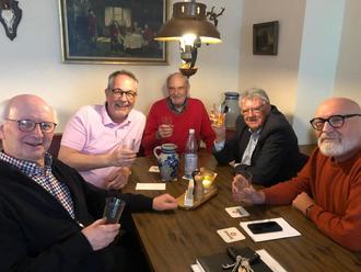 Mitglieder der Gesellschaft Tavola d'arte Limburg während einer abendlichen Zusammenkunft in der traditionsreichen Gastwirtschaft "Zum grünen Baum" in Altenhain im Taunus. V. l. n. r.: Frank Sittel, Stefan Bohlmann, Alfred Runkler, Jörg Rücker und Dr. Eberhard Dielmann.