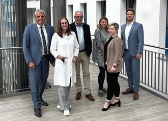 Sie sind sich einig: Eine ganzheitliche Patientenversorgung gelingt nur im Zusammenspiel aller Berufsgruppen (v.r.n.l.): Jens Rößner (Pflegedirektor), Isabel Ludwiczak und Peggy Burkhardt (stv. Pflegedirektorinnen), RA Erwin Reuhl (Verwaltungsratsvorsitzender), PD Dr. Katrin Neubauer-Saile (Ärztliche Direktorin) und Guido Wernert (Geschäftsführer).