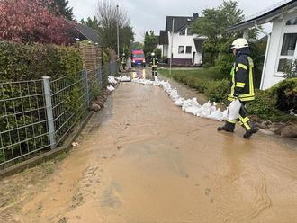 Einsatzkräfte der Feuerwehr verteilen der Sandsäcke, um das Eindringen von Wasser und Schlamm in die Häuser auf die Grundstücke zu verhindern.