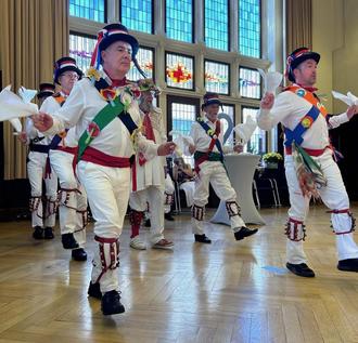 Die Brackley Morris Men mit ihren auffallenden Folklore-Kostümen zeigten nach der Begrüßung durch den Bürgermeister ihr tänzerisches Können. Der Name der Gruppe setzt sich aus der Stadt Brackley, der in der südwestlichen Ecke von Northamptonshire liegt, dem Morris Tanz, eine Form des englischen Volkstanzes sowie dem englischen Wort Men für Männer zusammen. Diese Art des Tanzes geht in seinen Ursprüngen zurück auf das 15. Jahrhundert, wo er im höfischen Rahmen von den unteren Klassen aufgeführt wurde. Weitere internationale Chöre wie der Mahidol University Choir aus Thailand und Atskana aus Babite/Lettland waren der Einladung ins Rathaus gefolgt.