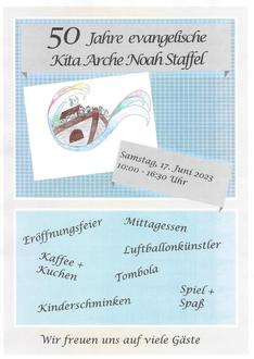Die KiTa „Arche Noah“ in Staffel feiert am Samstag, 17. Juni 2023 ab 10.00 Uhr ihr 50-jähriges Bestehen. Feiern Sie mit...