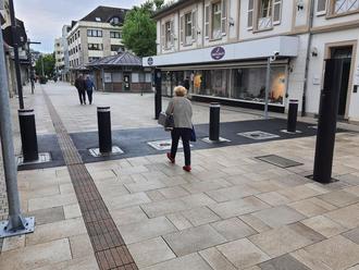 Die Zufahrtsschutzanlage regelt seit einigen Tagen am Neumarkt die Zufahrt. Die versenkbaren Poller befinden sich gerade im Boden, das ist während der Be- und Entladezeiten der Fall.