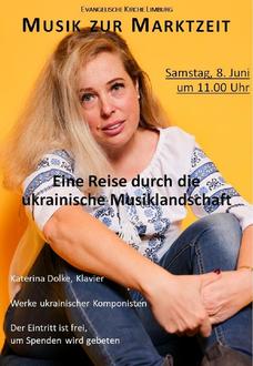 Musik zur Marktzeit in der Kirche: Eine Reise durch die ukrainische Musiklandschaft. Katerina Dolke (Klavier) spielt Werke ukrainischer Komponisten. Der Eintritt ist frei, um Spenden wird gebeten.