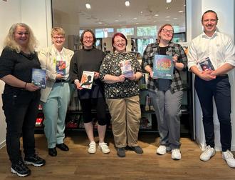 Die Initiatoren des queeren Regals freuen sich über die Bücherspenden und die gebotene Möglichkeit, die Literaturvielfalt in der Dombibliothek zu ergänzen. Von rechts nach links auf dem Bild: Robert Kleinmichel (Vorsitzender der Vereins LimBUNT), Maria Sievers (Vorsitzende des Vereins LimBUNT), Petra Jung (Autorin), Tanja Schnatz (Mitarbeitende des Kulturamtes der Stadt Limburg), Talia May (Autorin), Bianca Nias (Autorin).