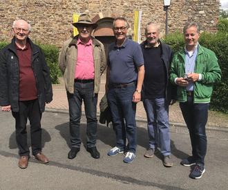 v.l.: Das Leitungsteam der Gesellschaft Tavola d'arte Limburg: Frank Sittel, Dr. Eberhard Dielmann, Stefan Bohlmann, Alfred Runkler und Thomas Hecker vor der romanischen Basilika in Mittelheim (Rheingau).