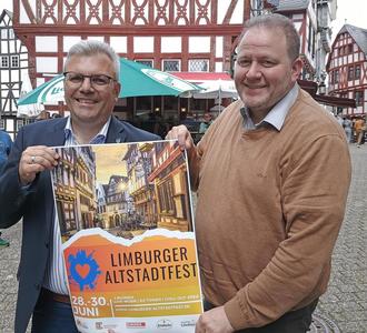 Auf das Wetter haben Limburgs Bürgermeister Dr. Marius Hahn und Organisator Martin Horne keinen Einfluss, da sind höhere Mächte gefordert. Für das, was am letzten Juni-Wochenende auf den Plätzen und in den Gassen der Altstadt abgehen soll, haben sich Stadt und Organisator mächtig ins Zeug gelegt. „Wir treten in einer neuen Konstellation an, um dem Altstadtfest eine langfristige Perspektive zu geben. Das wird natürlich einfacher, wenn wir einen guten Start hinlegen, auf den wir in den kommenden Jahren aufbauen können“, macht Bürgermeister Dr. Maris Hahn deutlich.