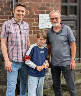 Jugendleiter Luis Metzner (links) und 1. Vorsitzender Detlef Kraut (rechts) begrüßen Moritz Szardien als 100. Mitglied des Schachvereins Lahn Limburg e. V. mit einem kleinen Präsent