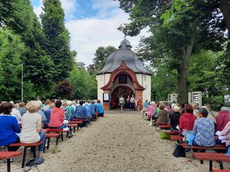 Nach dem Beginn im Rosengarten wurde der Gottesdienst vor der Herzenbergkapelle fortgesetzt. Auch im Evangelium war von einer starken Frau die Rede, die Jesus belehrt und so die Heilung ihrer kranken Tochter erreicht. Christine Mai und Susanne Winnekens-Udovic sprachen in ihrer Dialogpredigt von den vielfältigen Möglichkeiten, sich für wichtige Themen einzubringen und sich dabei selbst weiter zu entwickeln. In der anschließenden Aktion, aus bunten Fingerabdrücken eine gemeinsame Rose zu stempeln, waren die Frauen überrascht und erstaunt über das Ergebnis.