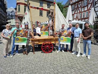 Mit vereinten Kräften Richtung Altstadtfest: Vor dem Piratenboot von Clown Rudi zeigen sich die Vertreterinnen und Vertreter der verschiedenen Sponsoren mit Organisator Martin Horne (6.v.l.) und Bürgermeister Dr. Marius Hahn (5.v.l.) bereit für ein buntes Veranstaltungswochenende.