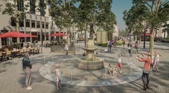 : In der Animation sprudeln die Wasserfontänen am Georgsbrunnen bereits. Mit der vorgeschlagenen Neugestaltung des Brunnens soll der Platz vor allem für Kinder attraktiver werden.