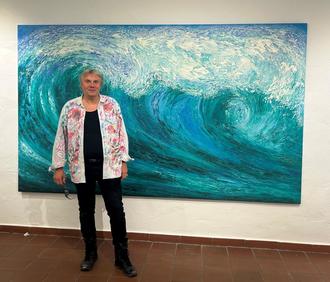 nsgar Skiba vor dem größten Bild der Ausstellung Natursehnsucht, das 180 x 300 cm misst. Den Wellen ist er seit gut 30 Jahren treu geblieben, wie der Künstler berichtet.