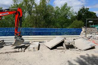 Von der Brüstung bleibt nur noch ein schmales Stück Richtung Brückenturm stehen. Der Rest ist bereits abgebaut.