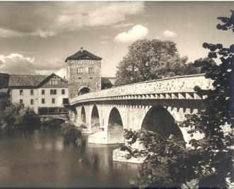 Die alte Lahnbrücke im Jahr 1953 mit sichtbarer Erweiterung und Brüstungsaufbau.