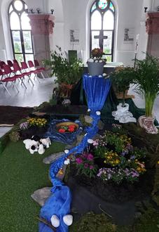 Im Gottesdienstraum im zweiten Stock unserer Kirche habe wir einen Stationenweg zum Psalm 23 aufgebaut. Eine Gartenlandschaft, einen Barfußweg, das dunkle Tal, den gedeckten Tisch und eine Ecke, um die Seele baumeln zu lassen - die Bildersprache des Psalms 23 kann man