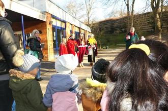 Das uns bekannte Lied wurde gesungen (Stern über Bethlehem) und die Kitakinder stimmten sofort mit ein. Dem Gebet und auch der Geschichte wurde zuvor gespannt gelauscht. Am Ende durfte die Spendendose gefüllt werden und die Sternsinger bekamen etwas Süßes für ihre Mühen.
