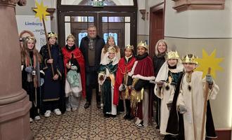 So auch im Rathaus der Stadt Limburg. Eine Gruppe aus neun Sternsingerinnen und Sternsingern der Pfarrei Hl. Katharina Kaspar Limburger Land besuchte gemeinsam mit Pastoralreferentin Katharina Kunkel Bürgermeister Dr. Marius Hahn im Rathaus.