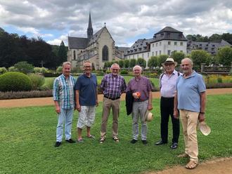 Leitungsteam der Gesellschaft Tavola d’arte Limburg (v.l.n.r.): Thomas Hecker, Stefan Bohlmann, Frank Sittel, Dr. Eberhard Dielmann und Alfred Runkler mit Clemens Schlimm (Mitte) vor dem Kloster Marienstatt (Westerwald).