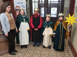 Über dem Eingang des Limburger Rathauses kündet das „20*C+M+B+26“ davon, dass die Sternsingerinnen und Sternsinger zu Besuch waren. Am Mittwoch, 07. Januar, zogen Hannah, Maranata, Jonathan und Emil unter der Begleitung von Birgit Sagmeister hörbar in das Rathaus ein, wo sie die Büroleitende Beamtin Silke Derichs in Vertretung des im Urlaub befindlichen Bürgermeisters Dr. Hahn willkommen hieß.